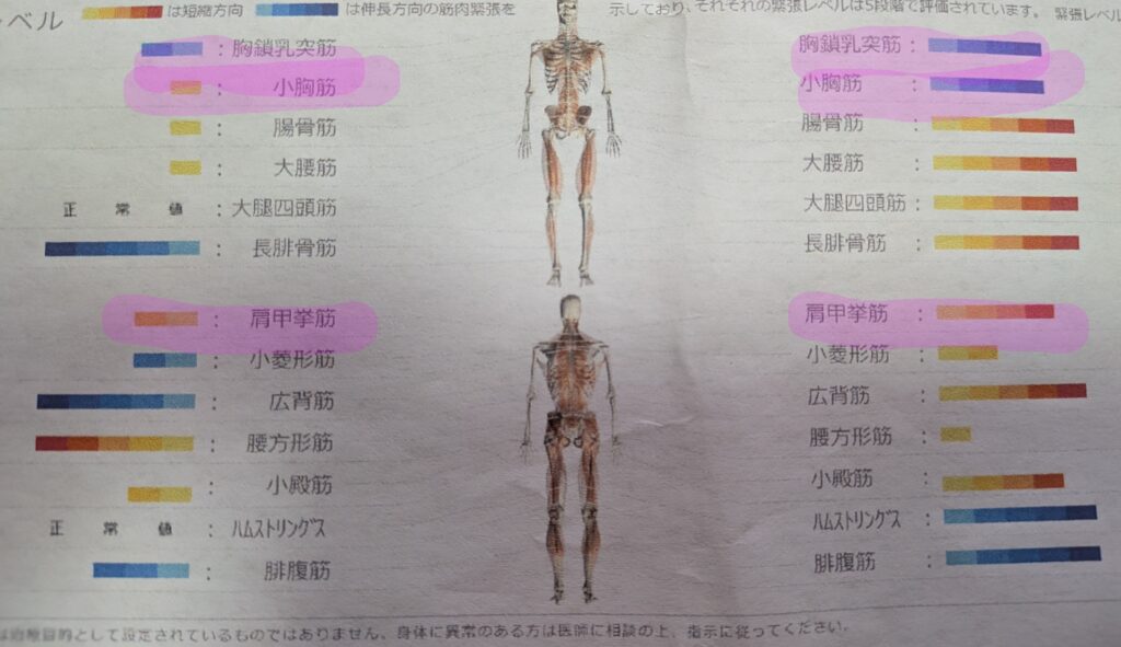 見て!これが私のリアルなデータだよ。首回りの筋肉がパンパンで、巻き肩の原因がまるわかり…..。